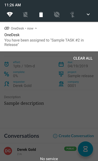 Brug OneDesk- mobilappen til at få besked på din telefon. Push-meddelelser giver dig besked, når du får tildelt en billet eller opgave, og om nye beskeder.
