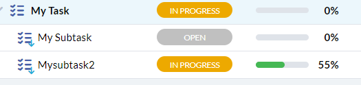 - Im Fall von mehreren Unteraufgaben wird die Hauptaufgabe in den Status „In Bearbeitung“ versetzt, wenn der Prozentsatz einer Unteraufgabe über 0 % liegt. Wenn alle Teilaufgaben mit 100 % markiert sind, wird die Hauptaufgabe auf den Status „Erledigt“ gesetzt.