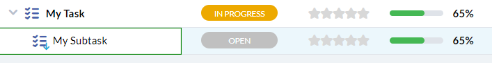 - Das heißt , wenn Sie eine Unteraufgabe auf über 0 % und unter 100 % setzen, ändert sich der Fertigstellungsgrad sowohl für die untergeordnete als auch für die übergeordnete Aufgabe UND der Status der übergeordneten Aufgabe wird automatisch auf „In Bearbeitung“ gesetzt, aber der Status der untergeordneten Aufgabe wird nicht geändert. Wenn Sie eine Unteraufgabe auf 100 % setzen, wird der Status der Hauptaufgabe auf “Fertig” und 100 % gesetzt. Während die Teilaufgabe auf 100 % gesetzt wird, wird ihr eigener Statuszustand nicht geändert.
