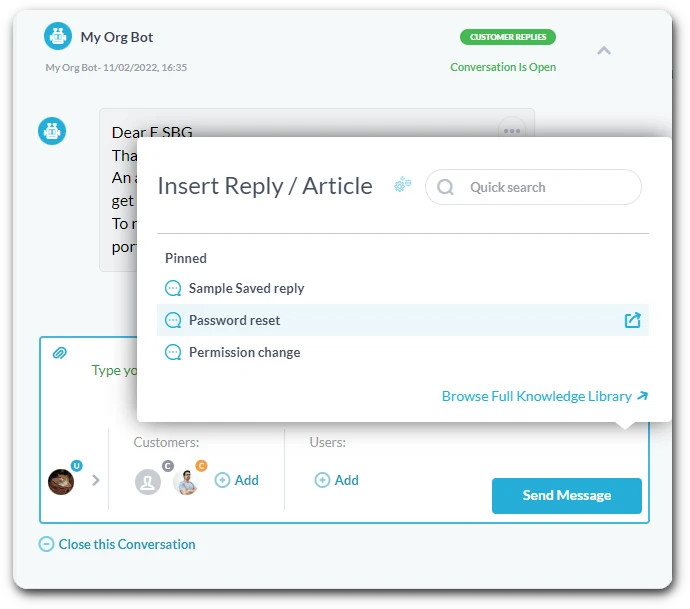 Cree respuestas predeterminadas sobre sus preguntas y problemas comunes. Inserta una respuesta con solo un clic. Las respuestas pueden ser tan sólidas como necesites, con imágenes, archivos adjuntos y más.