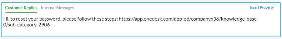Insertar un mensaje le permite enviar una respuesta de mensaje en la aplicación de mensajería interna de OneDesk. Puede optar por automatizar la inserción de un mensaje o crear una macro y luego seleccionar manualmente a qué elementos aplicar esa macro. El beneficio de insertar un mensaje es el siguiente: