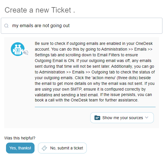 Before submitting tickets in the web forms, the AI bot provides answers, deflecting tickets for already known issues or common questions