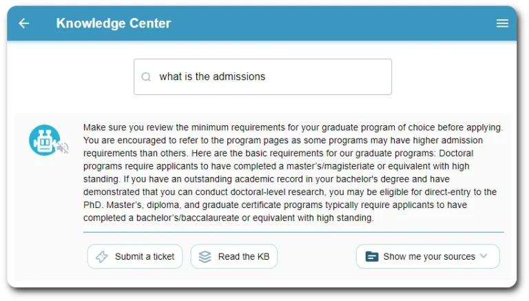Aid customer self service in your knowledgebase. The AI assistant summarizes your knowledge to provide the best answers when customers search your KB.