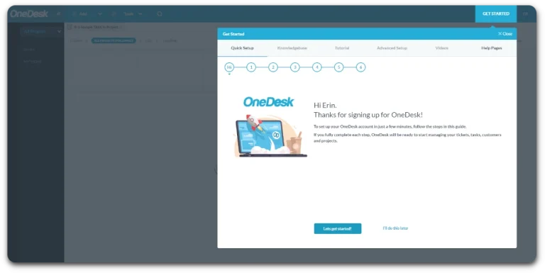 Le guide d’intégration OneDesk vous guide étape par étape pour configurer votre compte. Commencez ici pour en savoir plus sur la façon de tirer le meilleur parti de OneDesk. Si ce n’est pas déjà fait, créez un compte . . Nous proposons un essai complet de 14 jours au cours duquel vous pouvez essayer toutes les fonctionnalités et commencer à configurer votre compte.