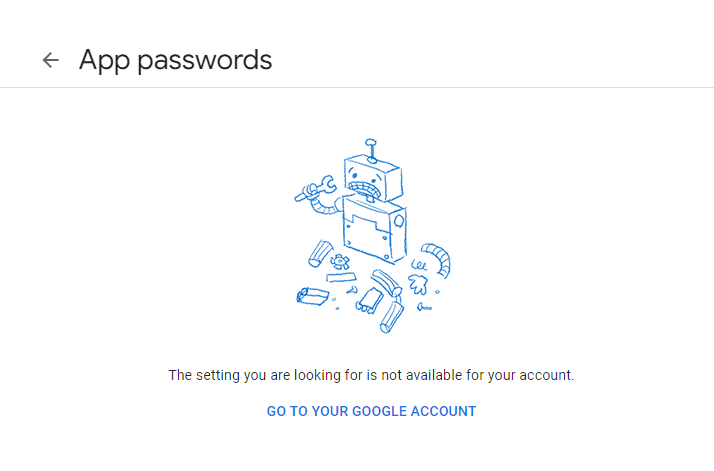 If you receive an error message like the image below, this is likely because two factor authentication (2fA) is not set-up in your account. In order to use a Google App password, 2FA must be enabled.