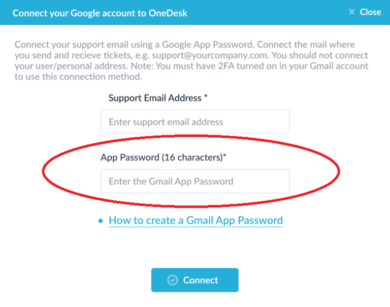 OneDesk helps you manage your support ticketing flow. In order to send and receive emails OneDesk can connect directly to your support account. The App Password enables this connection.
