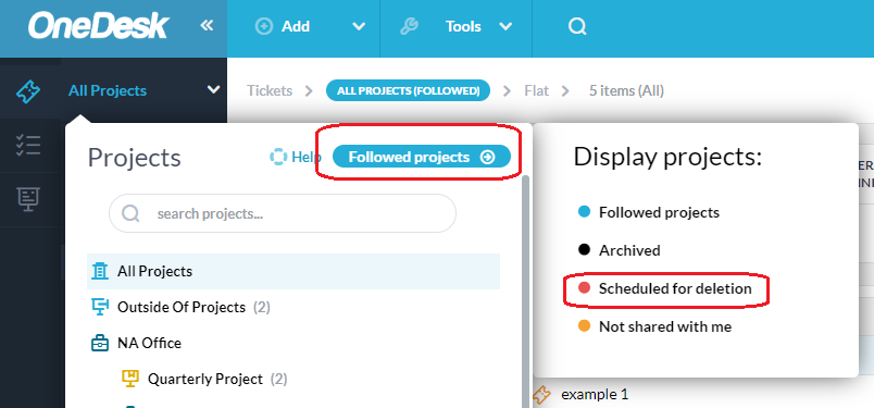 - In the ‘display projects’ side panel, change the scope to ‘scheduled for deletion’.