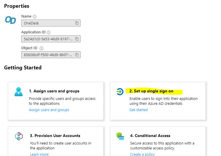 Inside the OneDesk app on the Azure Portal, click “Set up single sign on”.