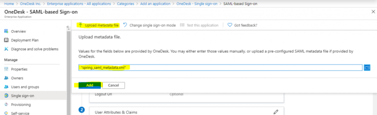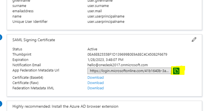 Back in the Microsoft Azure Portal, inside the ‘OneDesk Single sign-on’ app: