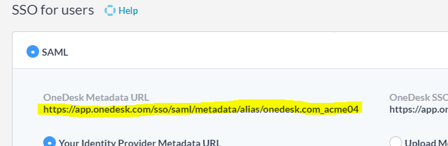 - In OneDesk, paste the ‘App Federation Metadata URL’ you copied earlier, into the ‘Your Identity Provider Metadata URL’ field.