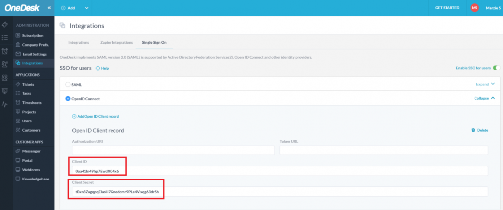7A) OpenID: Paste the Client ID and Client Secret into OneDesk