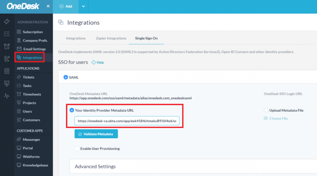 10B) SAML2: Paste your Identity Provider Metadata URL into OneDesk