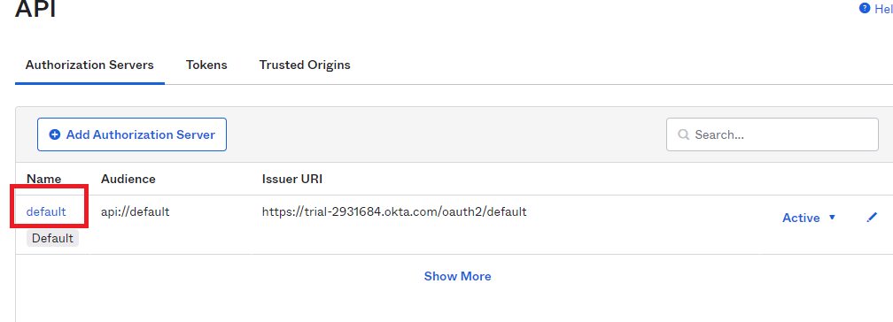 - Click the ‘default’ link next to the appropriate Authorization Server.