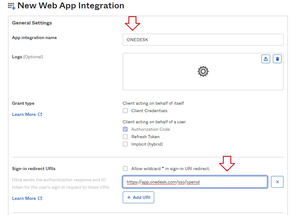 - Set the Sign-in Redirect URI to: https://app.onedesk.com/sso/openid