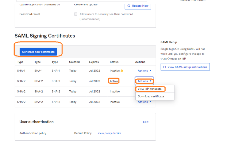 - Find the active certificate, and under Actions, select ‘View IdP metadata. ‘
