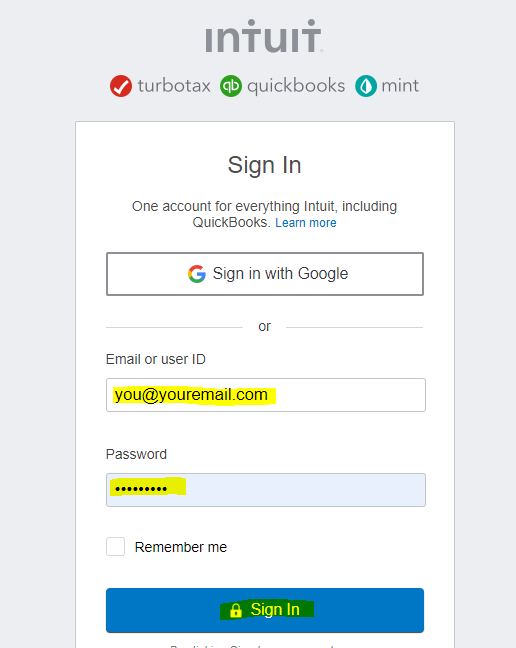 An OAuth popup will appear where you can enter your Intuit credentials and click ‘Sign In’.