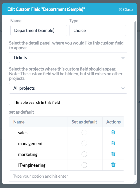 Puoi aggiungere un campo personalizzato “scelta” al tuo modulo web. Il campo personalizzato di scelta offre ai clienti un’opzione da selezionare durante la compilazione del modulo. Ad esempio, di seguito ho un campo personalizzato “reparto”. Per prima cosa crea il tuo campo personalizzato da Admin –> Campi personalizzati. Per ulteriori informazioni sui campi personalizzati, vedere: Campi personalizzati e campi personalizzati condizionali
