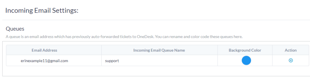 Qualsiasi casella di posta elettronica da cui inoltri automaticamente viene registrata in OneDesk come una “coda”. Puoi vedere tutte le caselle di posta che sono state inoltrate al tuo account da Amministrazione –> E-mail –> Impostazioni (puoi rinominare e codificare a colori le tue code anche da qui. Per informazioni dettagliate sulle code vedere anche: Code e-mail )
