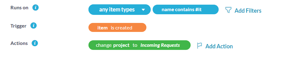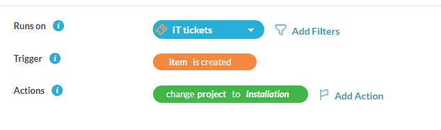 Questa automazione dovrebbe essere eseguita su ticket, filtrati per nome (il nome corrisponde alla riga dell’oggetto dell’e-mail). Per il filtro, seleziona la parola chiave su cui desideri indirizzare. Ad esempio, se la parola chiave è “#IT”, indirizzeremo il ticket al progetto del reparto IT. Come prima, dovremmo attivare questa automazione al momento della creazione. L’azione dovrebbe consistere nel “cambiare il progetto” nel progetto del dipartimento appropriato.
