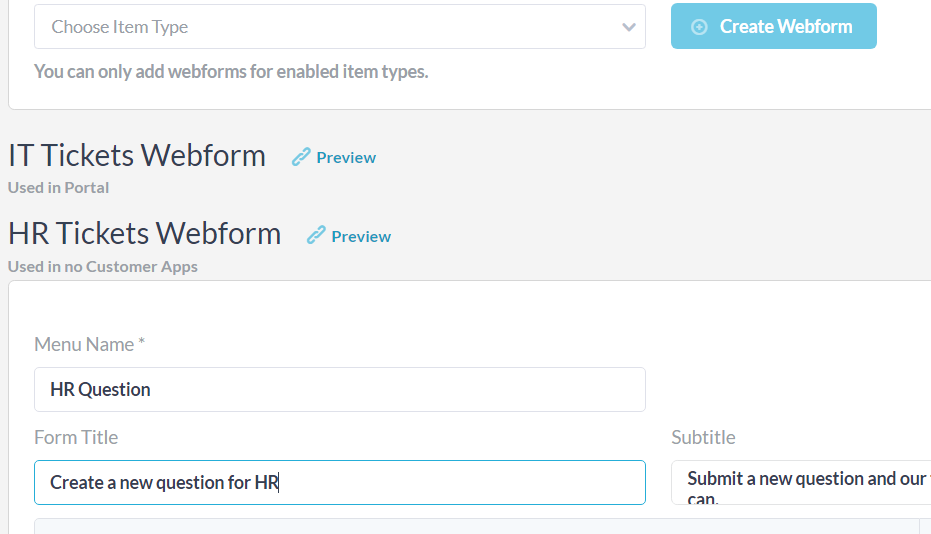 I moduli Web, o moduli di richiesta di supporto, sono un metodo che i tuoi clienti o utenti finali possono utilizzare per inviare i ticket. Puoi configurare moduli web per ogni tipo di biglietto che hai abilitato. Il modulo web per il tipo invierà quel tipo di biglietto. Ad esempio, abilita un tipo di ticket HR, quindi crea un modulo web per questo tipo. Per ulteriori informazioni sulla creazione di moduli Web, vedere: Informazioni sui moduli Web