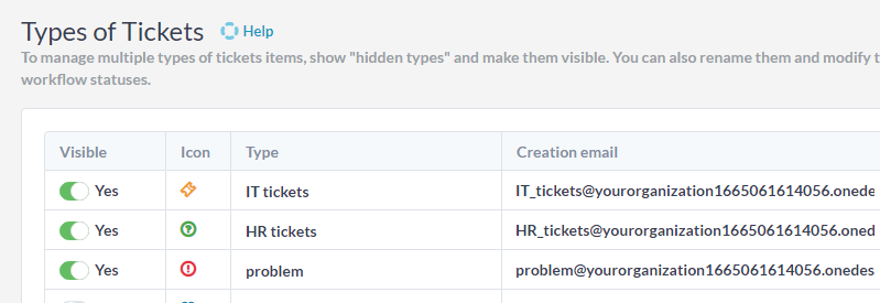 I tipi di biglietto sono una funzionalità in OneDesk che puoi pensare a categorie di biglietti. Puoi avere fino a dieci tipi di biglietto con il proprio nome, icona e statue. Il vantaggio dei tipi di ticket rispetto alle code è che ogni tipo ha i propri stati del ciclo di vita e automazioni separate. In altre parole possono passare attraverso diversi flussi di lavoro. Abilita un tipo di ticket aggiuntivo in Amministrazione –> Biglietti . Per i dettagli sui tipi di biglietto: Tipi di elemento