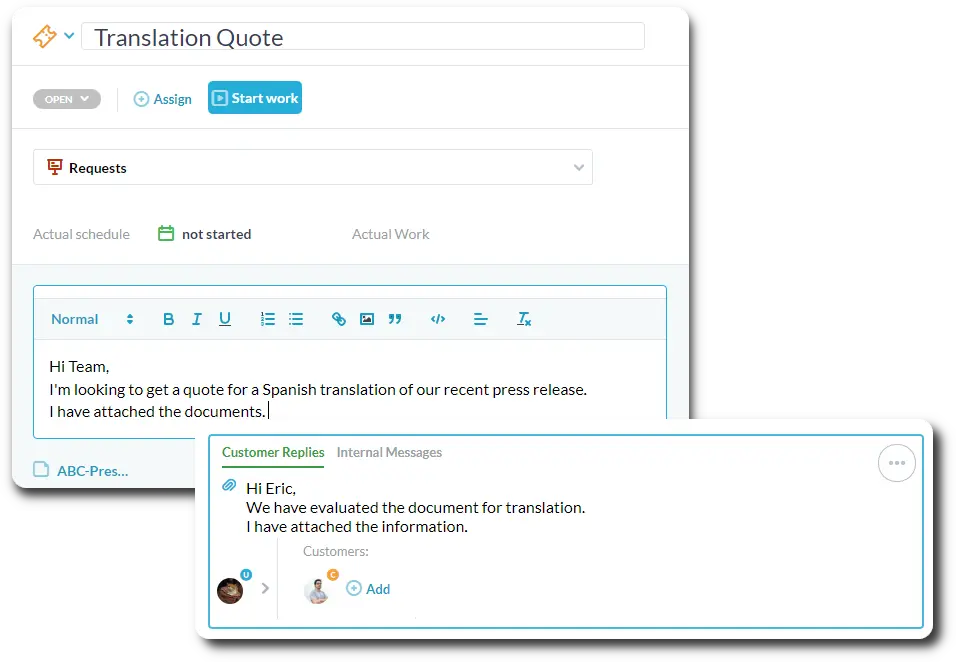 OneDesk ti consente di comunicare e collaborare facilmente con i tuoi clienti. I clienti possono scegliere di comunicare attraverso il loro canale preferito e le conversazioni sono centralizzate in OneDesk. Mantieni le conversazioni collegate a dettagli relativi a attività, ticket o progetti e tieni traccia di tutte le tue conversazioni in tempo reale.