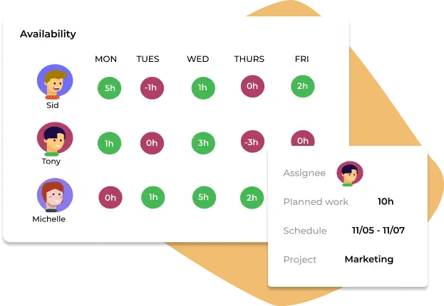 Assegna e pianifica le attività ai membri del team giusti. Quando assegni le attività, puoi visualizzare la disponibilità e la capacità di ciascun membro del team, in modo da poterle assegnare in modo efficiente. Dallo stesso strumento, puoi programmare o riprogrammare le date di inizio e di fine.
