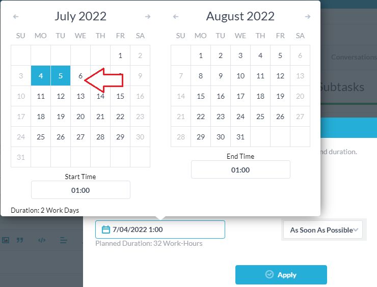 3. Impostare le date pianificate facendo clic sul campo delle date pianificate. Fare clic su un giorno per impostare l’attività per un giorno specifico. Fare clic e trascinare per specificare un’attività per più giorni.