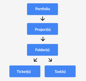 Portfolio’s en mappen creëren structuur. Portfolio’s organiseren projecten. Projecten zijn containers voor tickets en taken. Mappen kunnen verdere structuur geven door tickets of taken binnen het project vast te houden.