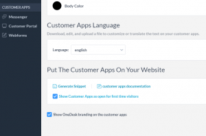 Om de OneDesk-widget voor klantapps met uw website te integreren, moet u een klein JavaScript-fragment toevoegen aan alle pagina’s op uw website waar u de widget beschikbaar wilt hebben. Als uw pagina’s dynamisch worden gegenereerd, kunt u het JavaScript-fragment toevoegen aan uw paginavoettekst. U kunt uw fragment vinden in het beheerpaneel van uw OneDesk-account, onder Beheer> Klant-apps. Klik op de link “Snippet genereren”.