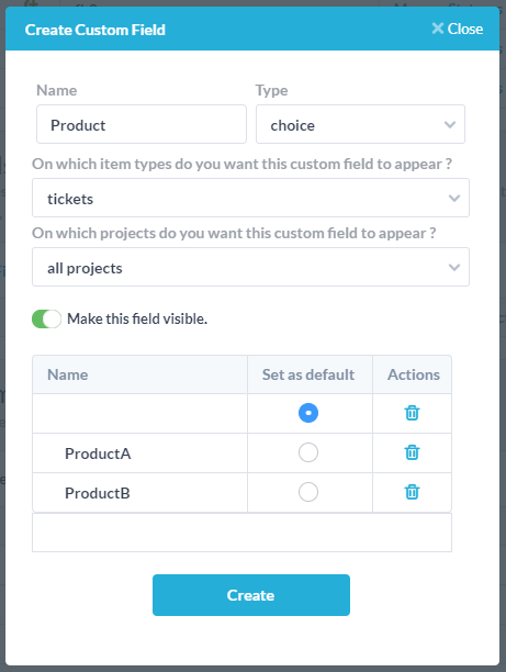 Hiermee wordt een aangepaste eigenschap (“Product”) op uw tickets gemaakt, waarmee u “ProductA” of “ProductB” kunt selecteren.