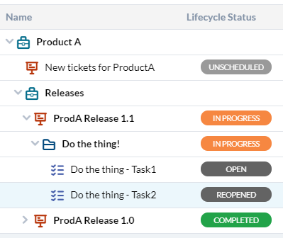 Hier heb ik een portfolio voor ProductA. Inside heeft een project gemaakt om inkomende tickets op te vangen en een ander portfolio met projecten voor elke release van ProductA. Sommige taken worden vervolgens gegroepeerd in een map in een van de releases.