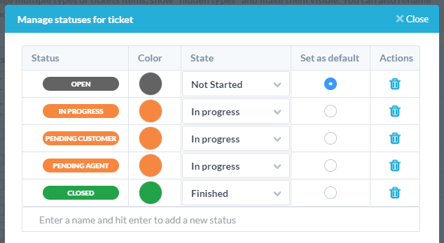In diezelfde tabel onder Administratie> Kaartjes> Soorten tickets klik op de link “Status beheren” naast elk type ticket dat je zichtbaar hebt gemaakt. In de pop-up die verschijnt, kun je de verschillende workflow-statussen wijzigen die elk tickettype kan doorlopen.