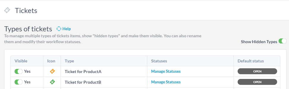 Ervan uitgaande dat u tickets voor uw producten anders wilt verwerken, moet u mogelijk verschillende soorten tickets inschakelen. U kunt dit doen onder