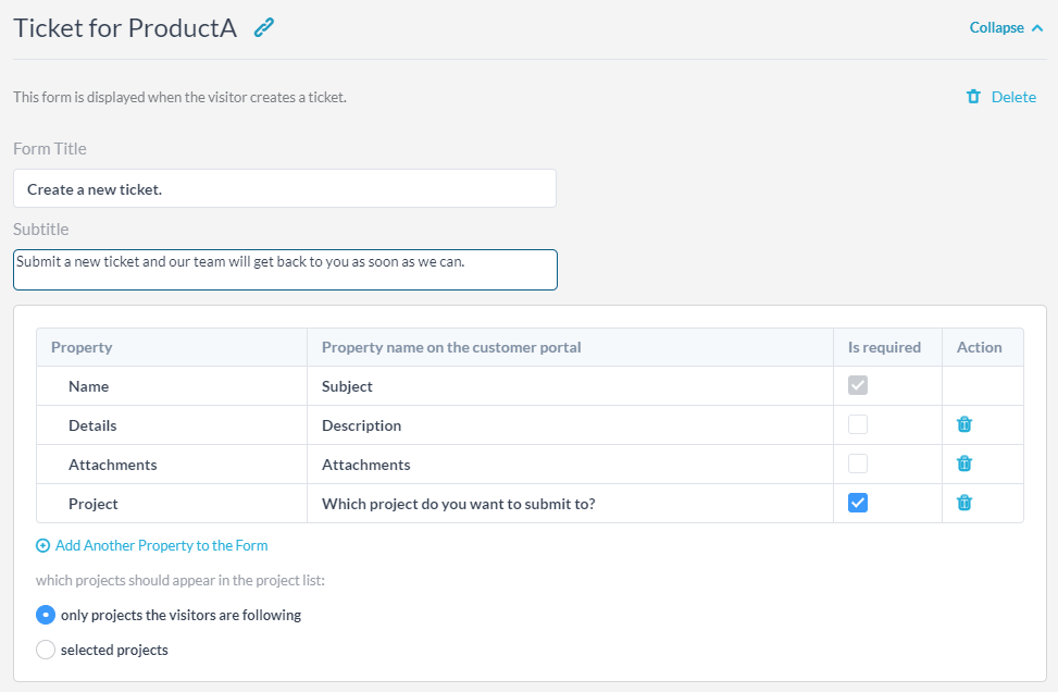 - Als u de eigenschap “Project” aan het formulier toevoegt, kan uw klant aangeven bij welk project het ticket moet worden ingediend. Er verschijnt een suboptie waarmee u kunt specificeren bij welke projecten ze kunnen indienen.