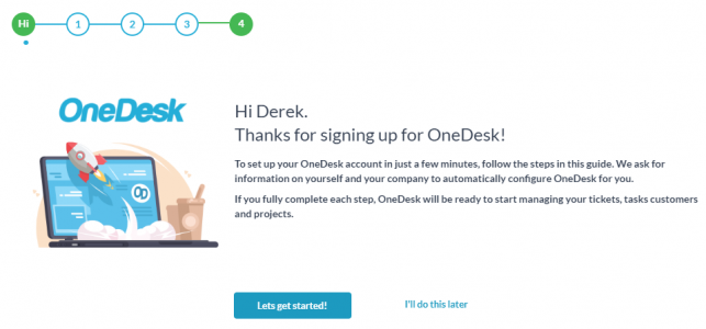 Å sette opp servicedesk trenger ikke å være et ork. OneDesk kommer med en veiviser som fører deg gjennom alle trinnene. Faktisk kan du være klar til å begynne å ta nye billetter og chatte live med kundene dine på bare noen få minutter. Hvis du støter på problemer, er teamet vårt alltid klare til å hjelpe.