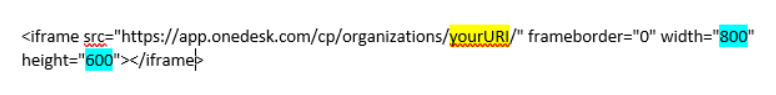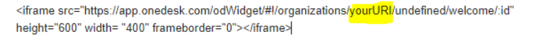 Ovenfor er et eksempel iFrame-kode som vil bygge inn portalen. Du må erstatte “yourURI” med din egen URI slik at den bygger inn din egen portal. Du kan finne din URI i OneDesk på Flere applikasjoner –> Administrasjon –> Selskapets preferanser. Du kan også justere skjermstørrelsen ved å endre bredde- og høydeverdiene.