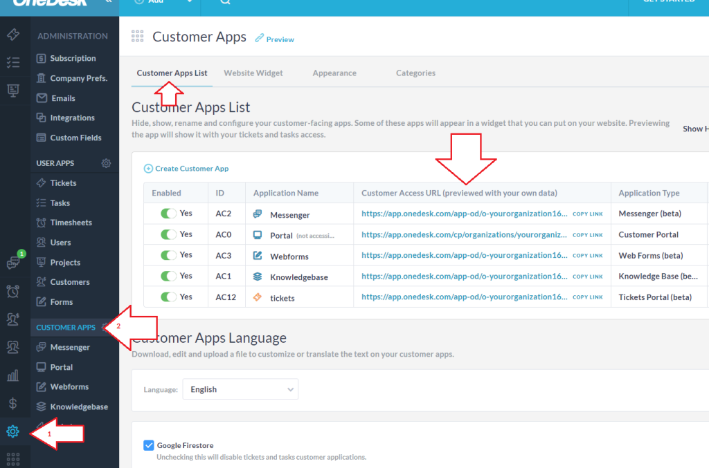 For å finne nettadressen for hver av programmene dine, gå til Administrasjon → Kundeapper → Liste over kundeapper → under kolonnen URL for kundetilgang. Disse nettadressene gir koblinger til fullskjermversjonen av hver app. Du kan forhåndsvise dem herfra også. Husk at billett- /oppgaveportalen , kunnskapsbasen, nettskjemaene og messenger er mobilvennlige, noe som betyr at en kunde som går inn på nettstedet ditt fra en mobilenhet komfortabelt kan bruke disse appene. Som alltid kan du konfigurere oppførselen eller utseendet til apper fra OneDesk-kontoadministrasjonsinnstillingene uten å gjøre ytterligere endringer på nettstedet ditt.