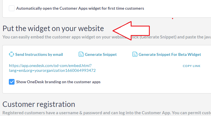 Widgeten er ganske enkel å legge til på nettstedet ditt. Bare legg til en liten JavaScript-kodebit i koden til nettsiden din. Du finner kodebiten din i administrasjonspanelet til OneDesk-kontoen din, under Administrasjon –> Kundeapper –> Nettsted Widge t. Klikk deretter på koblingen ” Generer kodebit “.