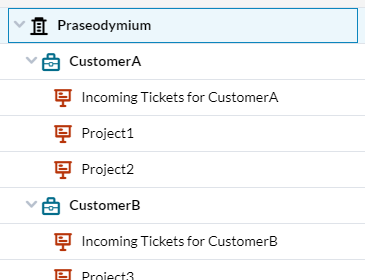 For å beskrive dette oppsettet vil vi bruke et eksempel på CustomerA som har inngått kontrakt med deg for å jobbe med en serie prosjekter Project1 og Project2. Du har også CustomerB som du gjør andre prosjekter for, og disse to kundene skal ikke se hverandres oppgaver eller billetter. I dette eksemplet vil vi også anta at du fakturerer for tiden du bruker på et prosjekt, men også for støtteaktiviteter du utfører for disse kundene.