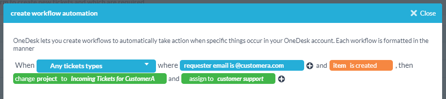 Når kunder sender inn nye billetter (eller oppgaver), vil du at de skal bli håndtert riktig. Det kan for eksempel være lurt å pipe dem inn i riktig prosjekt, og tildele dem til et bestemt team. Slik konfigurerer du det. Lag følgende regel under Administrasjon> Billetter> Arbeidsflyt automatisering> Opprett automatisering av arbeidsflyt