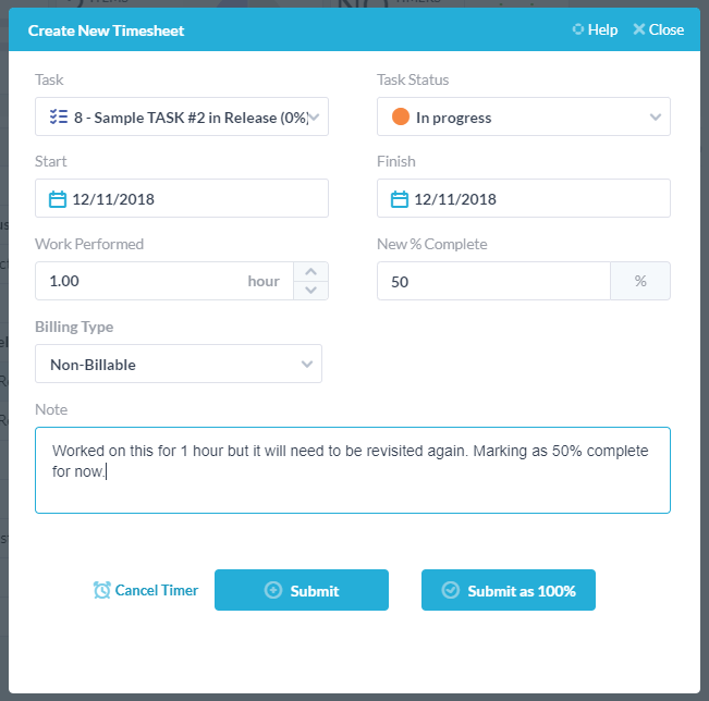 I eksemplet ovenfor fanget tiden utført arbeid, og brukeren oppdaterte% fullført og la til et notat. De kan også velge om det skal faktureres eller ikke faktureres, endre status eller endre datoene.
