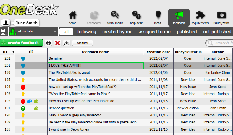 This is the “all feedback” view inside the main OneDesk platform. All product comments will arrive here: