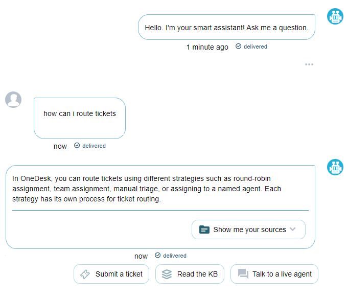 Оди работает, изучая данные в вашей учетной записи OneDesk (ваш корпус знаний), чтобы помочь ответить на вопросы о вашей компании, продуктах или услугах. На данный момент источники данных, доступные для использования ИИ, следующие: