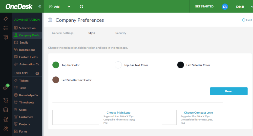 Хотите настроить OneDesk так, чтобы он выглядел по-другому? Тебе не нравятся цвета, которые мы выбрали для тебя? Хотите увидеть свой собственный логотип вместо нашего? Что ж, теперь вы можете! Администраторы OneDesk (в плане «Корпоративный») могут выбирать разные цвета для верхней панели, боковой панели и текста на них. Они также могут загрузить другой логотип. Рекомендуется сочетание розового и зеленого 😉