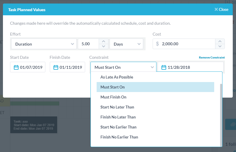 Вы можете установить ограничение даты для задачи во всплывающем окне «Запланированные значения задачи». По умолчанию OneDesk использует очень слабое ограничение «Начать не раньше» и выбирает сегодняшнюю дату или дату начала проекта. Есть и другие виды ограничений, которые вы можете выбрать, и их имена довольно легко понять: