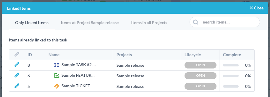 Задачи, билеты и другие элементы могут иметь отношения с другими элементами, которые не являются «связями планирования». Это просто специальные ссылки, чтобы сказать, что элементы связаны, например: «Эта задача связана с этим билетом», или «Эти два билета охватывают одну и ту же функцию», или «Эти задачи получены из этого запроса функции». Их можно найти в разделе «Связанные элементы» на панели сведений об элементе. При нажатии на эту ссылку открывается всплывающее окно, в котором вы можете увидеть связанные элементы и создать новые ссылки.