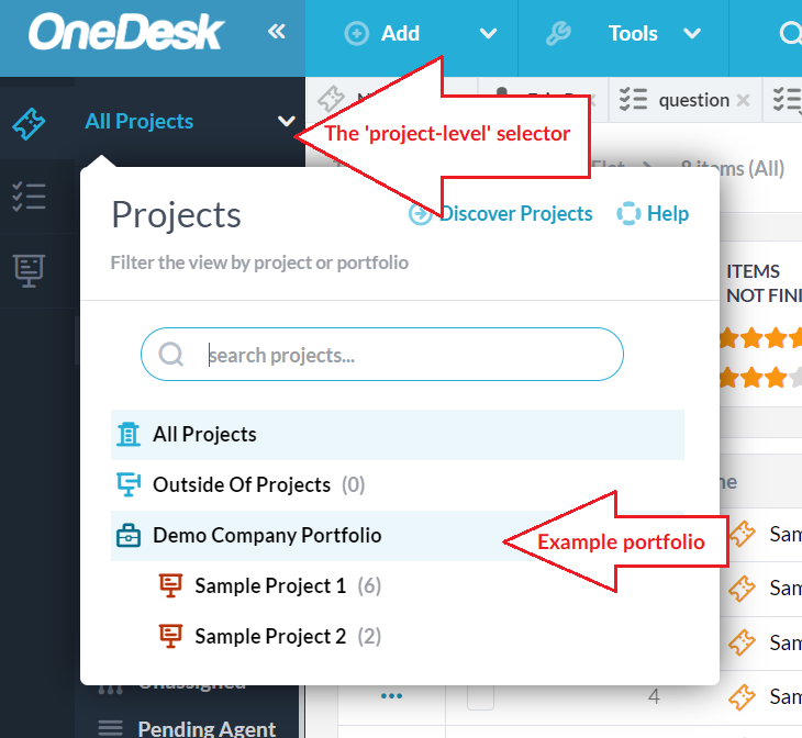 OneDesk has different objects to contain and organize information. The main objects that exist in OneDesk are: portfolios, folders, projects, and items. However, you can ONLY share projects and items, not portfolios and folders.
