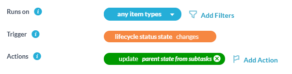This is a narrowly focused action that allows you to automatically propagate the status state of child tasks to their parent. In most cases the trigger event you select should be ‘status state changes’. There is a bit of nuance here worth understanding.