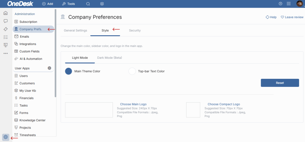 Want to configure the appearance of your OneDesk app to fit your company or preferences? Premium and Enterprise members of OneDesk can now White Label their web application via the Style tab in Company Preferences. To access this feature, navigate to Administration > Company Prefs. > Style.